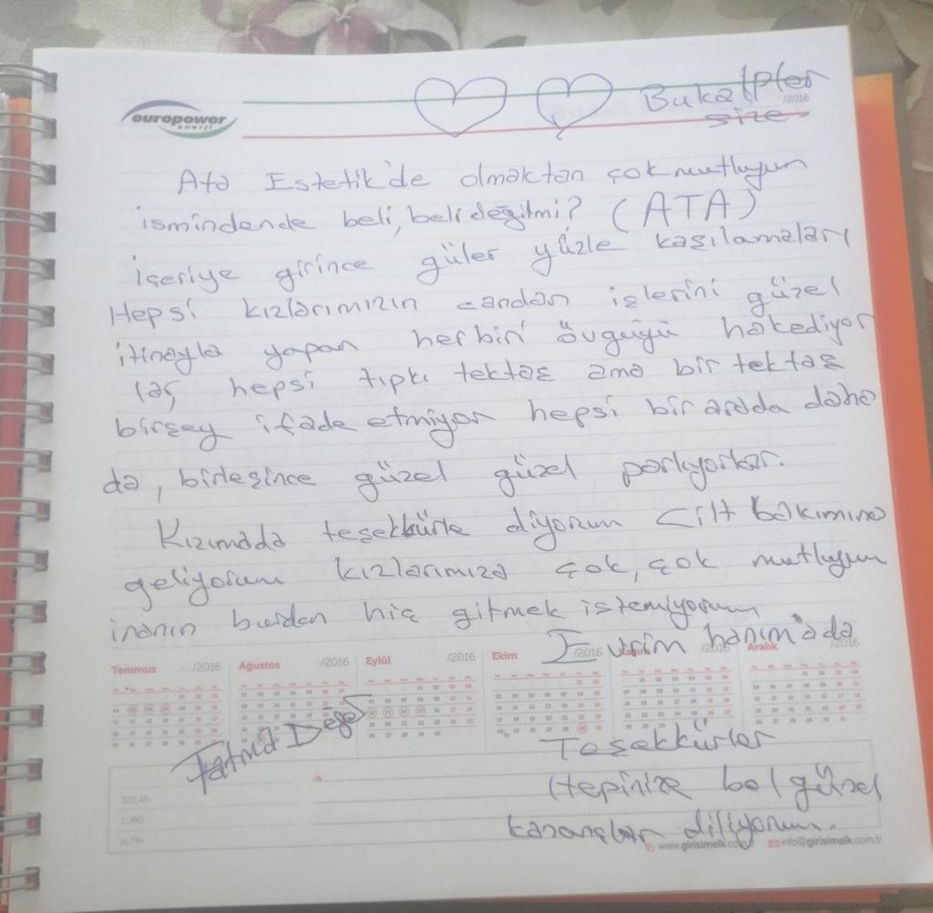 Ata Estetik'de olmaktan çok mutluyum ismindende belli değil mi? (ATA) İçeriye girince güler yüzle karşılamaları. Hepsi kızlarımızın candan işlerini güzel itinayla yapan herbiri övgüyü hakediyorlar, hepsi tıpkı tektaş ama bir tektaş birşey ifade etmiyor hepsi bir arada daha da, birleşince güzel güzel parlıyorlar.