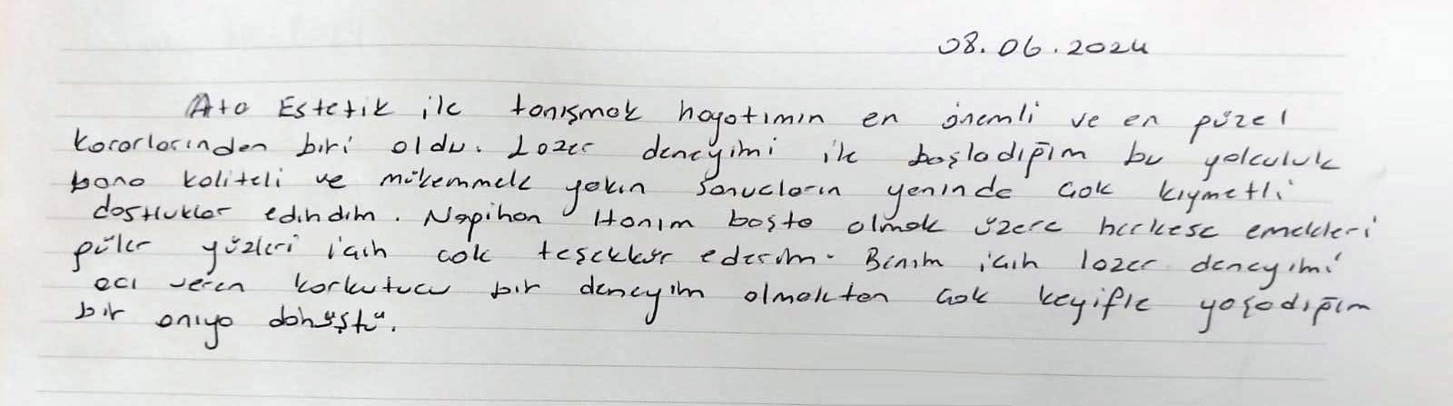 Ata Estetik ile tanışmak hayatımın en önemli ve en güzel kararlarından biri oldu. Lazer deneyimi ile başladığım bu yolculuk bana kaliteli ve mükemmele yakın sonuçların yanında çok kıymetli dostluklar edindim. Benim için lazer deneyimi acı veren korkutucu bir deneyim olmaktan çıktı.
