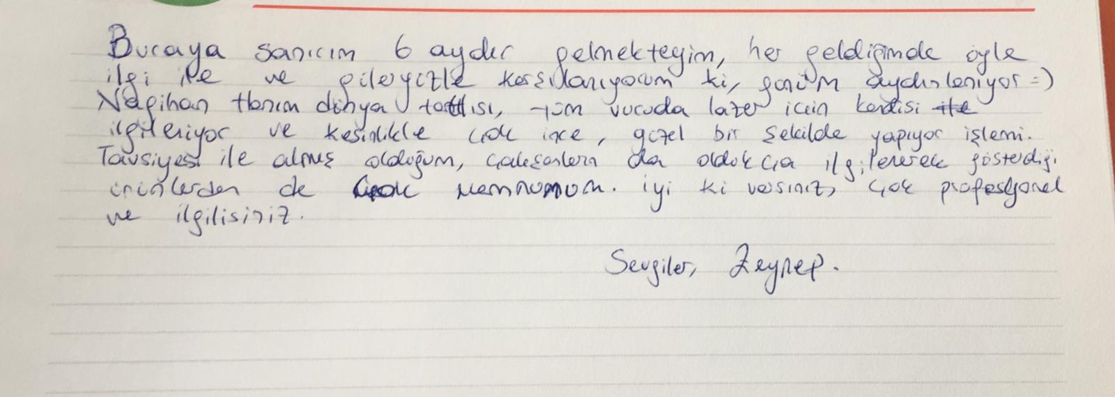 Buraya sanırım 6 aydır gelmekteyim, her geldiğimde öyle ilgi ile ve güleryüzle karşılanıyorum ki, günüm aydınlanıyor. Nagihan Hanım dünya tatlısı, tüm vücuda lazer için kendisi ilgileniyor ve kesinlikle çok ince, güzel bir şekilde yapıyor işlemi. Tavsiyesi ile almış olduğum, çalışanlarında oldukça ilgilenerek göstermiş olduğu ürünlerden de çok memnunum. İyi ki varsınız, çok profesyonel ve ilgilisiniz.