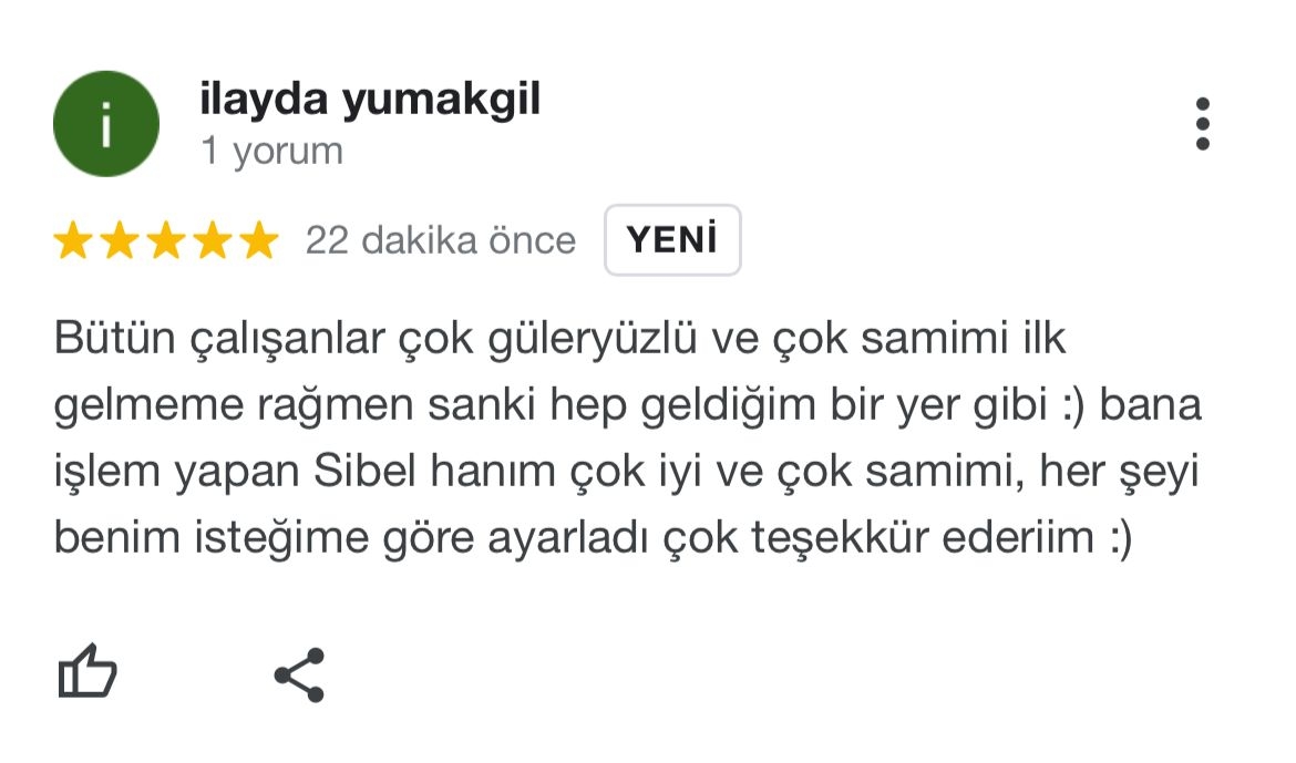 Bütün çalışanlar çok güleryüzlü ve çok samimi ilk gelmeme rağmen sanki hep geldiğim bir yer gibi :) Bana işlem yapan Sibel Hanım çok iyi ve çok samimi, her şeyi benim isteğime göre ayarladı çok teşekkür ederim :)