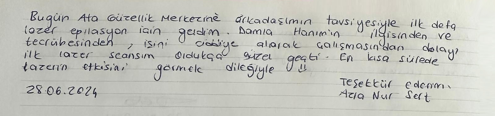 Bugün Ata Güzellik merkezine arkadaşımın tavsiyesi ile ilk defa lazer epilayon için geldim. Damla hanımın ilgisinden ve tecrübesinden, işine ciddiye alarak çalışmasından dolayı ilk lazer seansım oldukça güzel geçti.