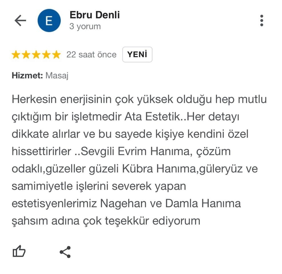 Herkesin enerjisinin çok yüksek olduğu hep mutlu çıktığım bir işletmedir Ata Estetik. Her detayı dikkate alırlar ve bu sayede kişiye kendini özel hissettirirler. Sevgili Evrim hanıma, çözüm odaklı, güzeller güzeli Kübra Hanıma, güleryüz ve samimiyetle işlerini severek yapan estetisyenlerimiz Nagehan ve Damla Hanıma şahsım adına çok teşekkür ediyorum.