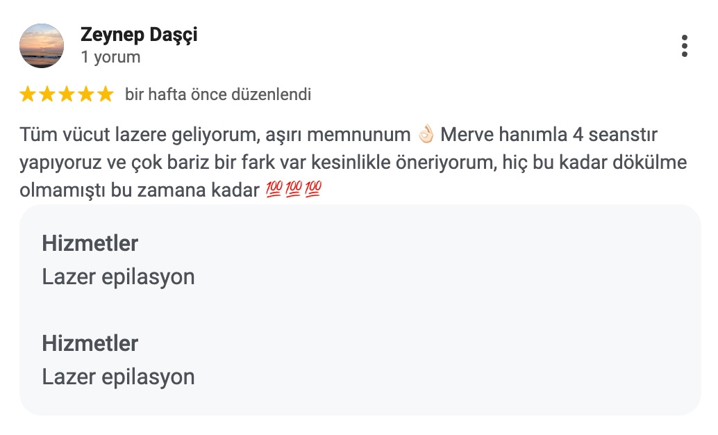Tüm vücut lazere geliyorum, aşırı memnunum. Merve hanımla 4 seanstır yapıyoruz ve çok bariz bir fark var kesinlikle öneriyorum, hiç bu kadar dökülme olmamıştı bu zamana kadar.